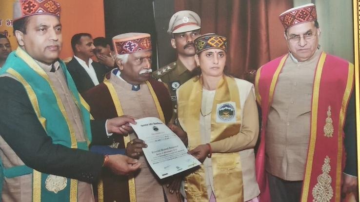 राजकीय आदर्श वरिष्ठ माध्यमिक विद्यालय धुन्दन में कार्यरत करुणा शर्मा को अंग्रेजी साहित्य में डॉक्टर की मानद उपाधि से सम्मानित किया गया। उन्हें यह सम्मान प्रदेश के राज्यपाल बंडारू दत्तात्रेय, मुख्यमंत्री जयराम ठाकुर व शिक्षामंत्री सुरेश भारद्वाज ने हिमाचल प्रदेश विश्वविद्यालय शिमला के सम्मान समारोह में प्रदान किया। डॉक्टर करुणा शर्मा वर्तमान में राजकीय आदर्श वरिष्ठ माध्यमिक पाठशाला धुन्दन में अंग्रेजी प्रवक्ता के पद पर कार्यरत है। डॉ करुणा शर्मा ने समस्त विद्यालय परिवार से मानद उपाधि हासिल करने पर खुशी जाहिर की साथ ही विद्यालय परिवार को मिष्ठान भी बांटा। उन्होंने अपने अनुभव सांझा करते हुए बताया कि कड़ी मेहनत से यह सपना पूरा किया व बच्चों को प्रेरणा लेने के लिए भी प्रोत्साहित किया। उन्होंने इसका पूरा श्रेय अपने पति राजकुमार को दिया, जिनके सहयोग से आज वह डॉक्टर की उपाधि से सम्मानित किए गए। प्रधानाचार्य सरताज सिंह राठौर, उप प्रधानाचार्य प्रकाश चंद बट्टू व उनके परिवार जनों सहित समस्त विद्यालय परिवार ने डॉ करुणा शर्मा को इस उपलब्धि पर बधाई दी।