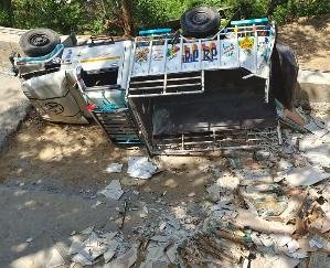 उपमण्डल देहरा के अंतर्गत मनकोटिया भोजनालय के समीप एक पंजाब नम्बर का टेम्पो अचानक पलट गया जिससे टेम्पो बुरे तरीके से क्षत्रिग्रस्त होने का मामला प्रकाश में आया है। बताया जा रहा है गाड़ी नम्बर PB 11 CJ 2263 लुधियाना से धर्मशाला की ओर जा रही थी कि अचानक ढलियारा एनएच503 पर टेम्पो का एक्सल टूटने से टायर खुल गया वहीं मौके पर ही गाड़ी पलट गई है। टेम्पो में बैठे चालक एव परिचालक तो बच गए परन्तु टेम्पो बहुत ही बुरे तरीके से क्षतिग्रस्त हो गया। चालक की पहचान हरभजन निवासी लुधियाना के रूप में हुई है। चालक हरभजन ने बताया कि गाड़ी में ऐसी लोड किये हुए थे जिन्हें धर्मशाला पहुंचना था परन्तु ढलियारा के समीप ही यह हादसा हो गया। जब इस संदर्भ में डीएसपी देहरा अंकित शर्मा से बात की गई तो उन्होंने बताया कि पुलीस को अभी तक इस मामले की कोई सूचना नहीं मिली है।