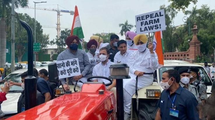कृषि कानूनों के विरोध में ट्रैक्टर से संसद भवन पहुंचे राहुल गांधी