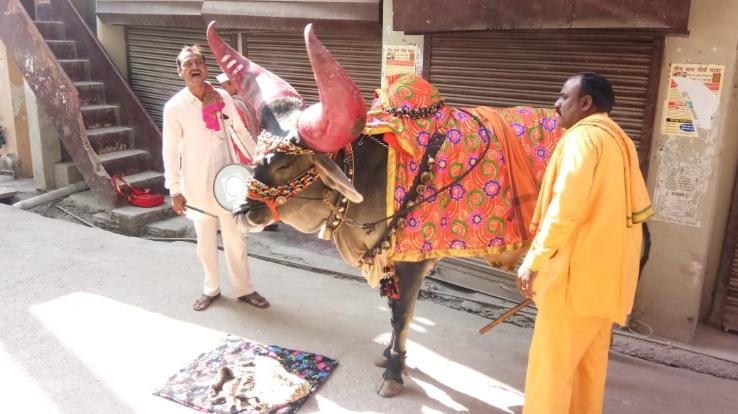 हिन्दू संस्कृति में नन्दी बैल का अहम स्थान है। भोले शंकर को प्रिय होने की उनकी अनेको कहानियां है। मंगलवार को कुनिहार बाज़ार में ऐसा ही कुछ नजारा देखने को मिला, जब शिरडी नासिक महाराष्ट्र से कुछ लोग नन्दी बैल को लेकर पहुंच गए। नन्दी महाराज के साथ समाधान नागधन गंगामई, सम्भाजी गोडे व जालिंदर कनाडो ने बातचीत में बताया कि यह नन्दी सौराष्ट्र गुजरात से लाया गया है व हज़ारो बैलो में इस तरह का नन्दी कोई एक होता है। काँग्रेज नस्ल का बड़े बड़े सींगों वाला यह नन्दी कुनिहार बाजार में लोगो के आकर्षण का केंद्र बन गया। लोग नन्दी के साथ आये महात्माओं से अपनी समस्याओं को पूछते नजर आए। समाधान बाबा ने बताया कि नन्दी महाराज की कृपा से जिन महिलाओं के संतान नही होती, उन महिलाओं को नन्दी महाराज की कृपा व आशीर्वाद से संतान सुख मिलता है। इसी तरह व्यापार व अन्य समस्याओं के बारे में समाधान सहित भविष्य के बारे में नन्दी जी महाराज बताते है। अपने भविष्य को जानने के लिए युवा वर्ग, महिलाओं व अन्य लोगो मे जिज्ञासा देखने को मिली ।