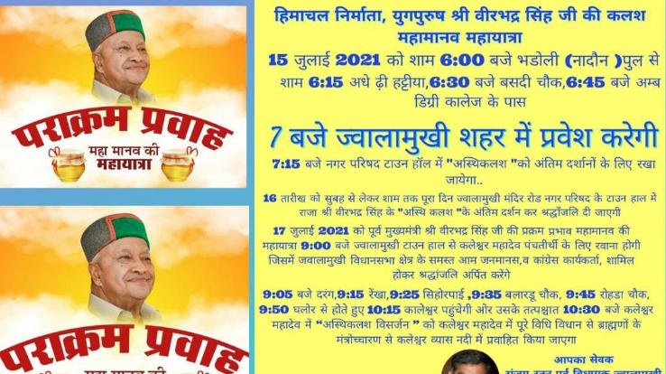 पूर्व विधायक संजय रत्न ने जानकारी देते हुए बताया कि ज्वालामुखी विधानसभा क्षेत्र के अंतर्गत पूर्व मुख्यमंत्री स्व०राजा वीरभद्र सिंह की कलश यात्रा आगामी कल दिनाँक 15 जुलाई को शाम 6:00 बजे भडोली पुल से ज्वालामुखी तक निकाली जाएगी। सभी कांग्रेसजन, आम जनमानस 15 जुलाई को शाम 6:00 बजे भडोली पुल पर एकत्रित होकर कलश यात्रा में शामिल होकर साथ चलेंगे। उसके तत्पश्चात शाम 6:15 अधे दी हट्टीया, 6:30 बजे बसदी चौक, 6:45 बजे अम्ब डिग्री कालेज के पास होती हुई 7:00 बजे ज्वालामुखी शहर में प्रवेश करेगी।उसके बाद 7:15 बजे नगर परिषद टाउन हॉल में "अस्थिकलश "को अंतिम दर्शानों के लिए रखा जायेगा।आगामी दूसरे दिन दिनाँक 16.07.2021 को सुबह से लेकर शाम तक पूरा दिन ज्वालामुखी मंदिर रोड नगर परिषद के टाउन हाल में स्व० राजा वीरभद्र सिंह के "अस्थि कलश" के अंतिम दर्शन कर श्रद्धाँजलि दी जाएगी। जिसमें जवालामुखी विधानसभा क्षेत्र के समस्त आम जनमानस व कांग्रेस कार्यकर्ता शामिल होकर श्रद्धांजलि अर्पित करेंगे।तीसरे दिन दिनाँक 17.07.2021 को पूर्व मुख्यमंत्री स्व०वीरभद्र सिंह की प्रक्रम प्रभाव की यात्रा 9:00 बजे ज्वालामुखी टाउनहाल से कलेश्वर महादेव पंचतीर्थी के लिए रवाना होगी,और 9:05 बजे दरंग, 9:15 रेंखा,9:25AM सिहोरपाई, 9:35 बलारडू चौ, 9:45 रोहडा चौक, 9:50 घलौर से होते हुए 10:15 कालेश्वर पहुंचेगी और उसके तत्पश्चात 10:30 बजे कलेश्वर महादेव में 'अस्थिकलश विसर्जन' को कलेश्वर महादेव में पूरे विधि विधान से ब्राह्मणों के मंत्रोच्चारण से कलेश्वर व्यास नदी में प्रवाहित किया जाएगा।