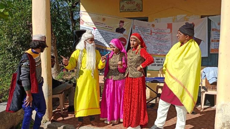 पूजा कलामंच बाड़ीधार के कलाकारों ने नालागढ़ विधानसभा क्षेत्र की ग्राम पंचायत नंड तथा लुनस में गीत-संगीत एवं नुक्कड़ नाटकांे के माध्यम से कल्याणकारी योजनाओं की जानकारी प्रदान की।