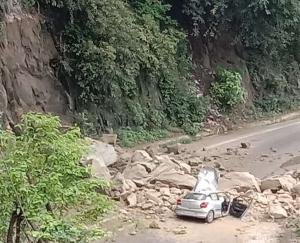 नूरपुर में राष्ट्रीय राजमार्ग पर आज दोपहर को सड़क किनारे भारी भरकम चट्टान खिसक कर कार पर गिर गई। जैसे ही निकटवर्ती लोगों ने कार पर चट्टान गिरते ही देखी तो हाहाकार मच गया। मौके पर मौजूद तुरंत बचाव कार्य में जुट गए। कड़ी मेहनत के बाद कार से कार चालक को सुरक्षित बाहर निकाल लिया गया। घायल व्यक्ति की पहचान अवतार सिंह निवासी बडूखर के रूप में हुई है। घायल व्यक्ति को तुरंत नूरपुर अस्पताल ले जाया गया। इस हादसे में अवतार सिंह की टांग फ्रैक्चर हुई है। जानकारी अनुसार अवतार सिंह अपनी गाड़ी एचपी 97-4533 से धर्मशाला से अपने घर बडूखर जा रहा था कि नूरपुर में अचानक उसकी कार पर चट्टान गिर गई। एसएचओ कल्याण सिंह ठाकुर पुलिस टीम के साथ मौके पर पहुंचे। दो दिन पहले भी देर रात को हादसे वाले स्थान के निकट भारी भरकम चट्टान सड़क पर गिर गई थी जिससे करीब दो घंटे पठानकोट - मंडी नेशनल हाइवे पर जाम रहा लेकिन लोक निर्माण विभाग ने तब रात को साढ़े 12 बजे यातायात बहाल कर दिया था।